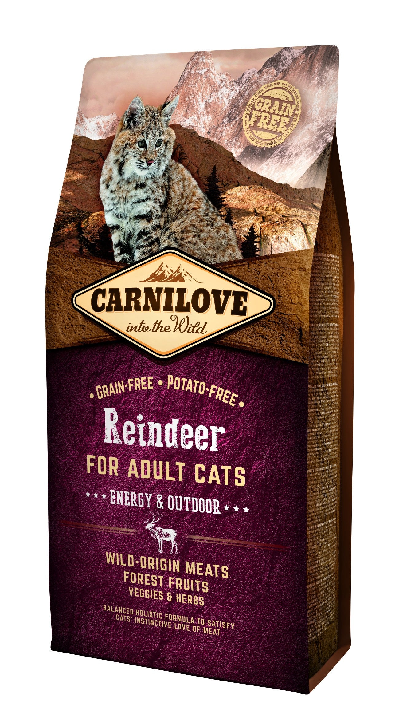 Grazie al suo elevato tenore in antiossidanti naturali, grassi insaturi ed Omega 3, la carne di renna è ideale per apportare l’energia spesa nelle avventure feline fuori casa. Grazie a frutti di bosco, verdure ed erbe officinali, la formula apporta nutrienti, vitamine, minerali e antiossidanti essenziali per una forma fisica ottimale e un sistema immunitario efficiente ogni giorno.