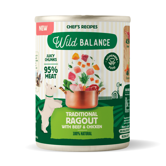 Ottenuto da ingredienti naturali al 100%, cotti lentamente e con tanto amore, Wild Balance Traditional Ragout è un alimento umido in lattina in succulenti bocconi completo, grain-free, senza acqua aggiunta, con tre proteine animali perfettamente complementari e soprattutto con una ricetta molto semplice: