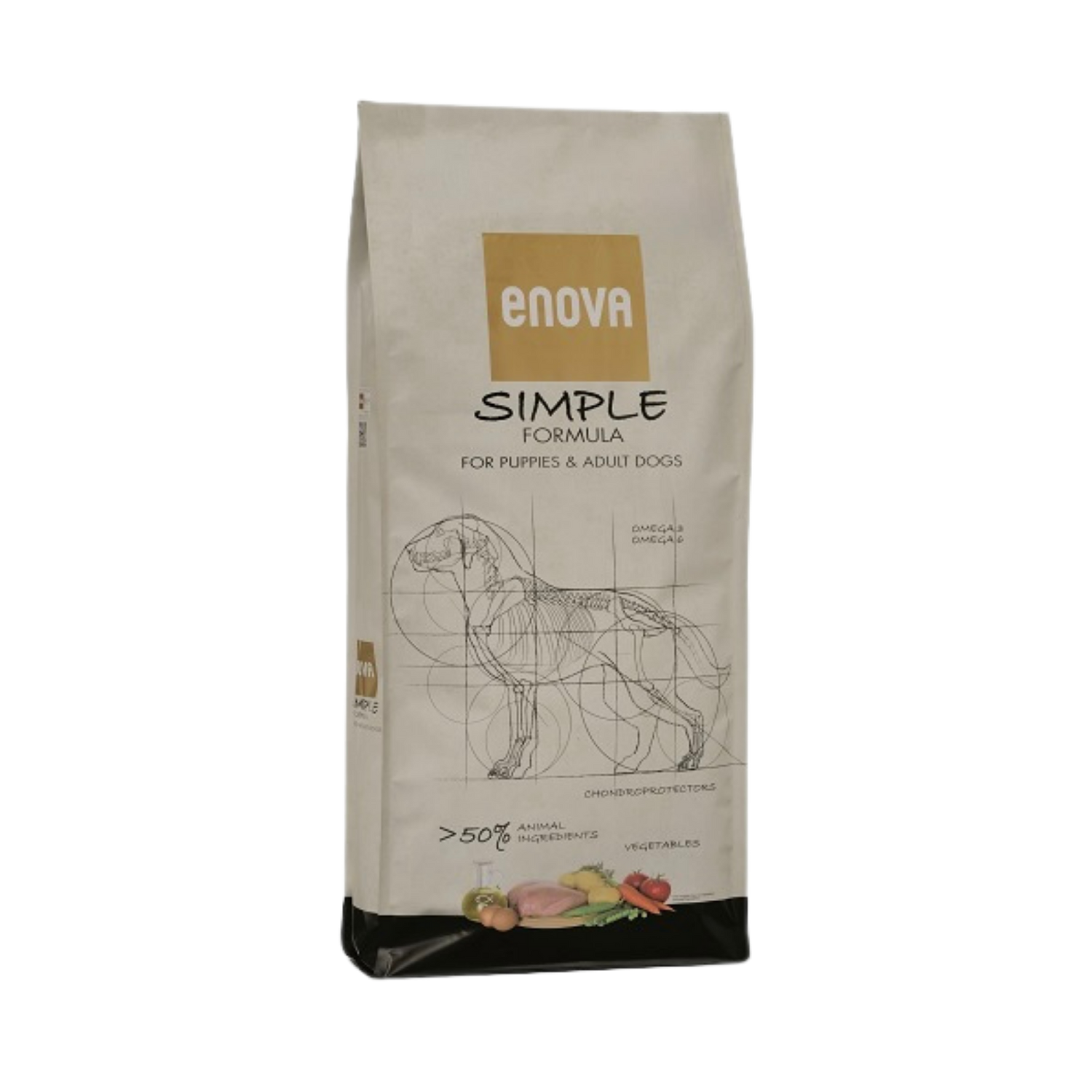 Questo prodotto nutre al meglio cani di tutte le età, razze e taglie. ENOVA SIMPLE è un alimento perfettamente bilanciato, con un ulteriore vantaggio nutrizionale: è completamente privo di cereali. Grazie al suo elevato tenore in calorie e in pregiate proteine animali, ENOVA SIMPLE soddisfa pienamente le esigenze nutrizionali di cani adulti attivi, così come di cuccioli, cuccioloni e cagne in lattazione. Si tratta, inoltre, di un alimento di mantenimento perfetto per tutti quei cani adulti i cui proprietari vogliono solo il meglio per il loro beniamino!